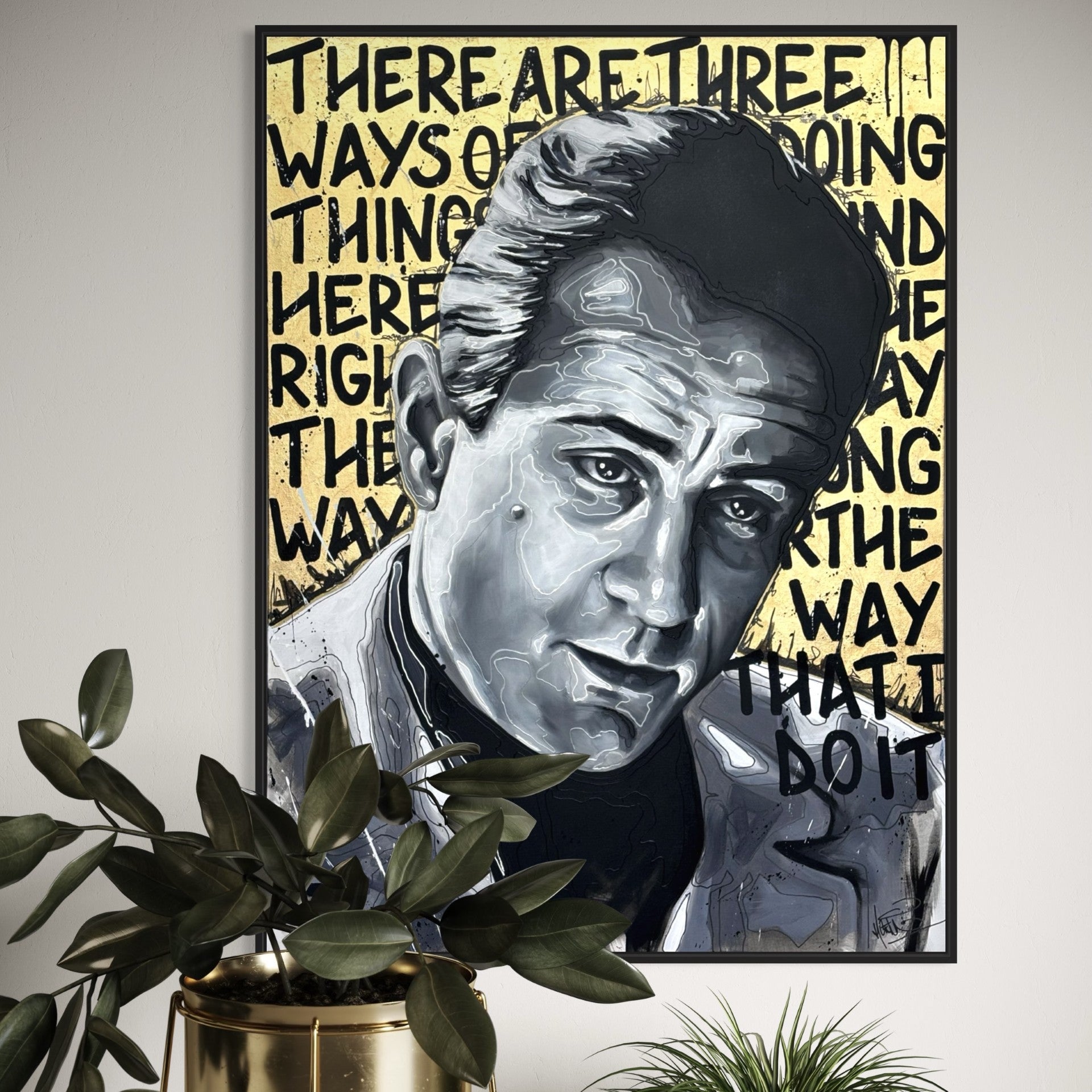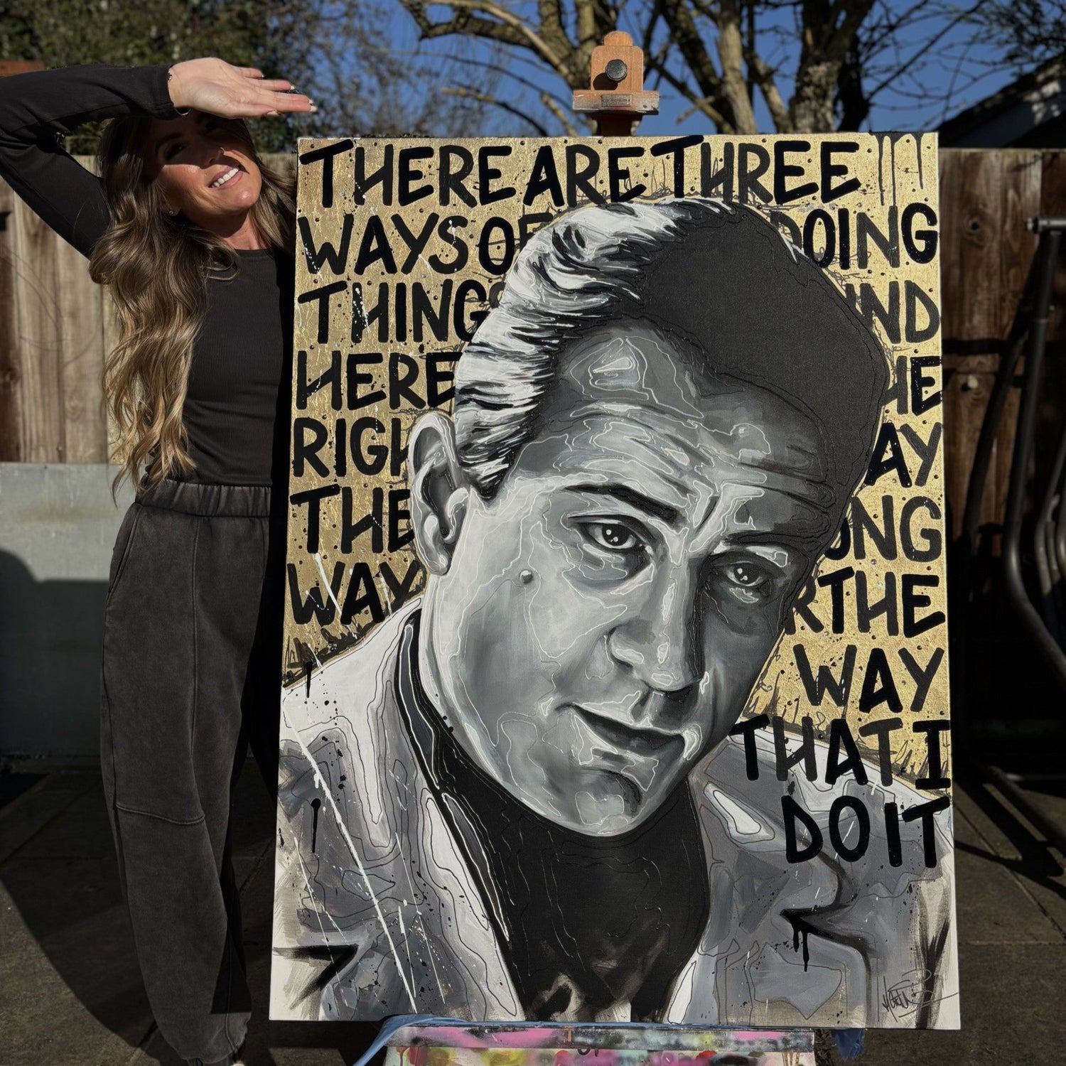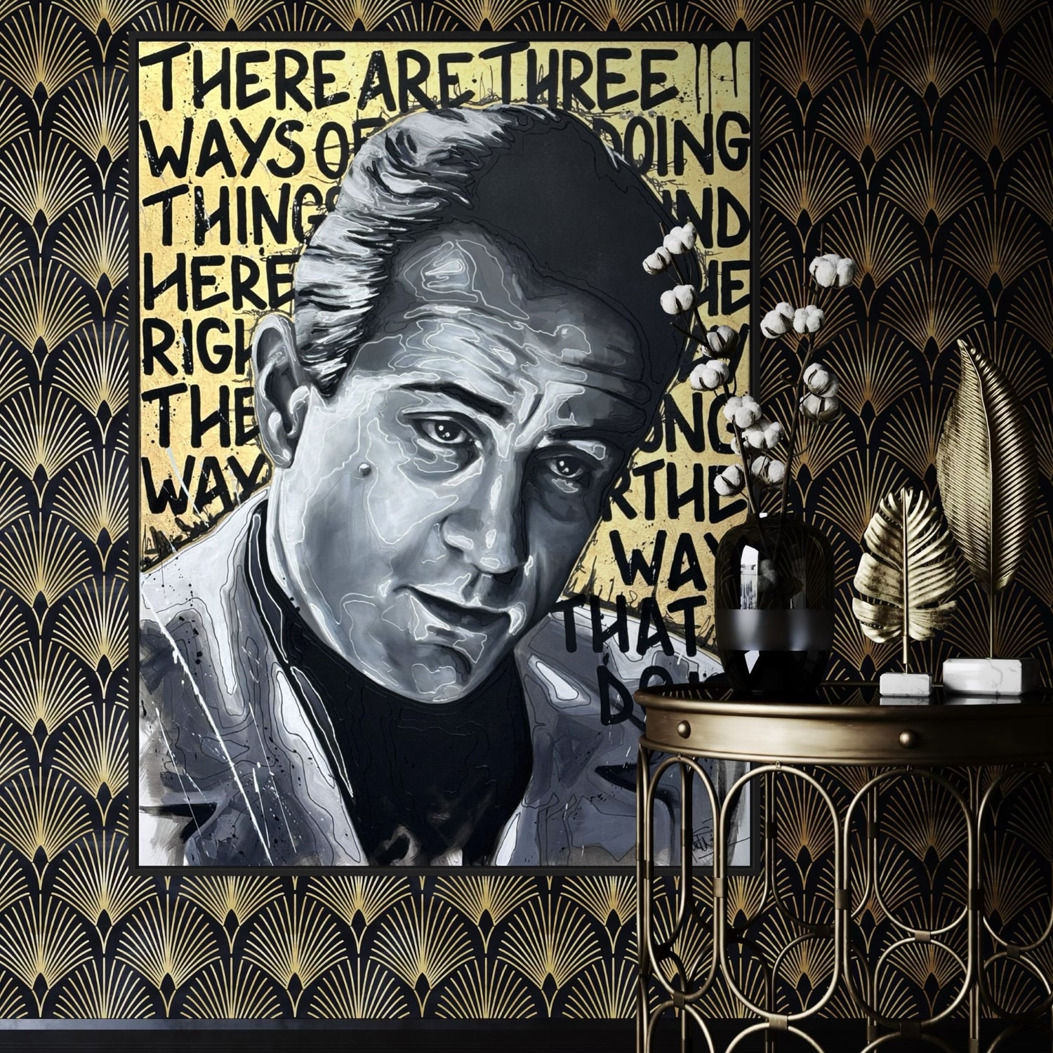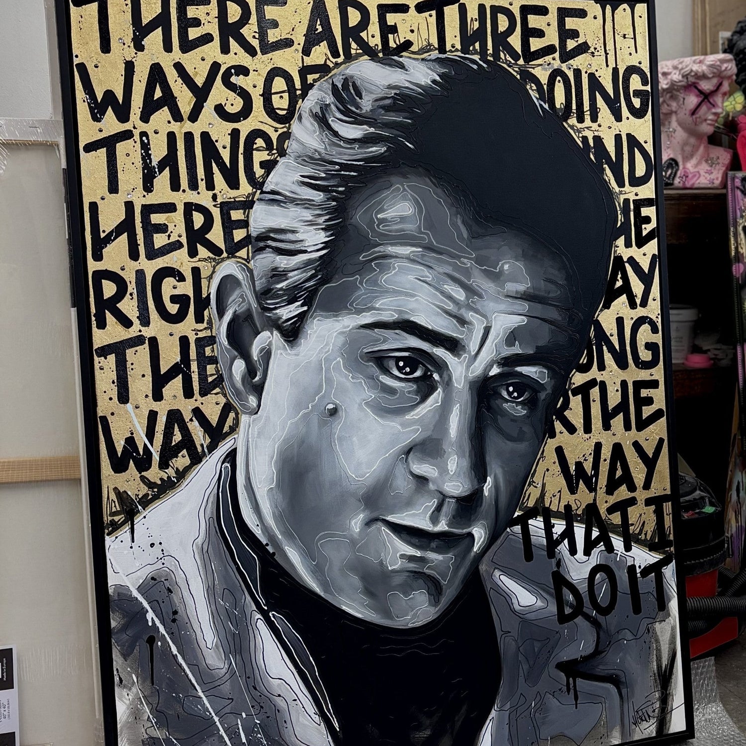 This acrylic painting on a 121cm x 91cm slim canvas is my take on the legendary Robert De Niro. I wanted to capture his unmistakable presence with bold brushstrokes and rich detail. The gold leaf adds a little extra drama and depth, making it a real statement piece for any DeNiro fan or art lover.