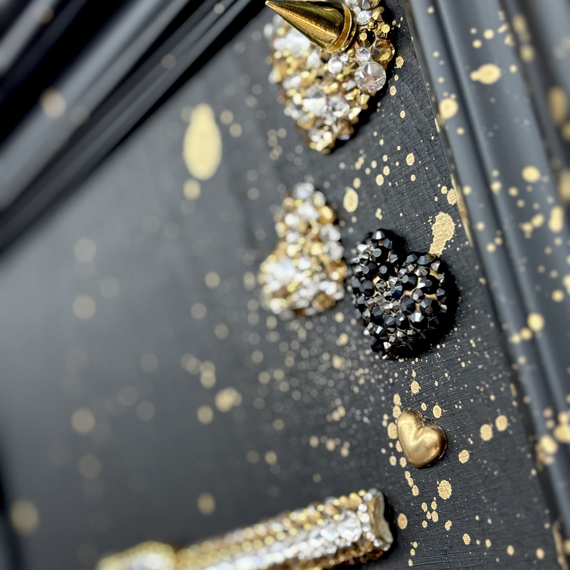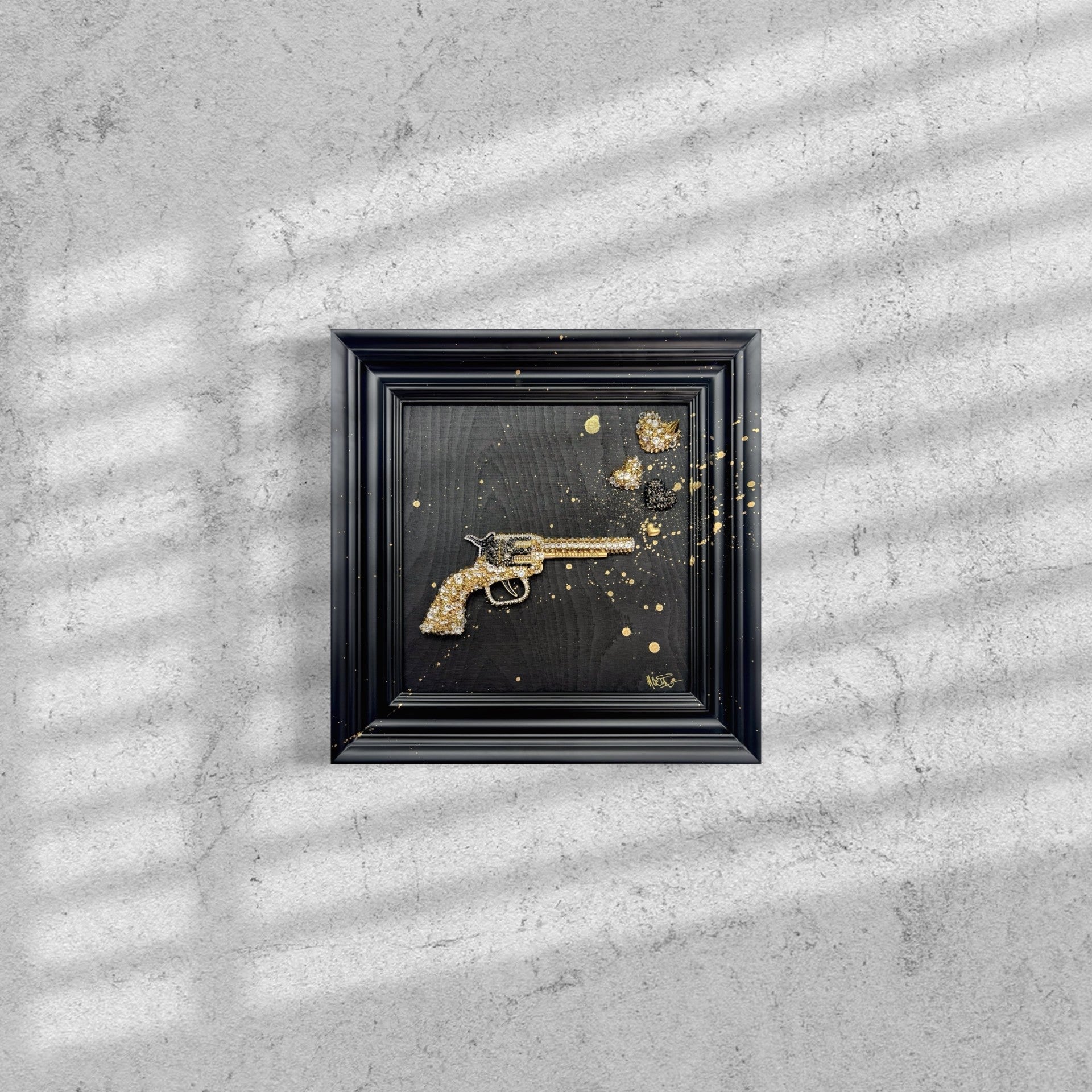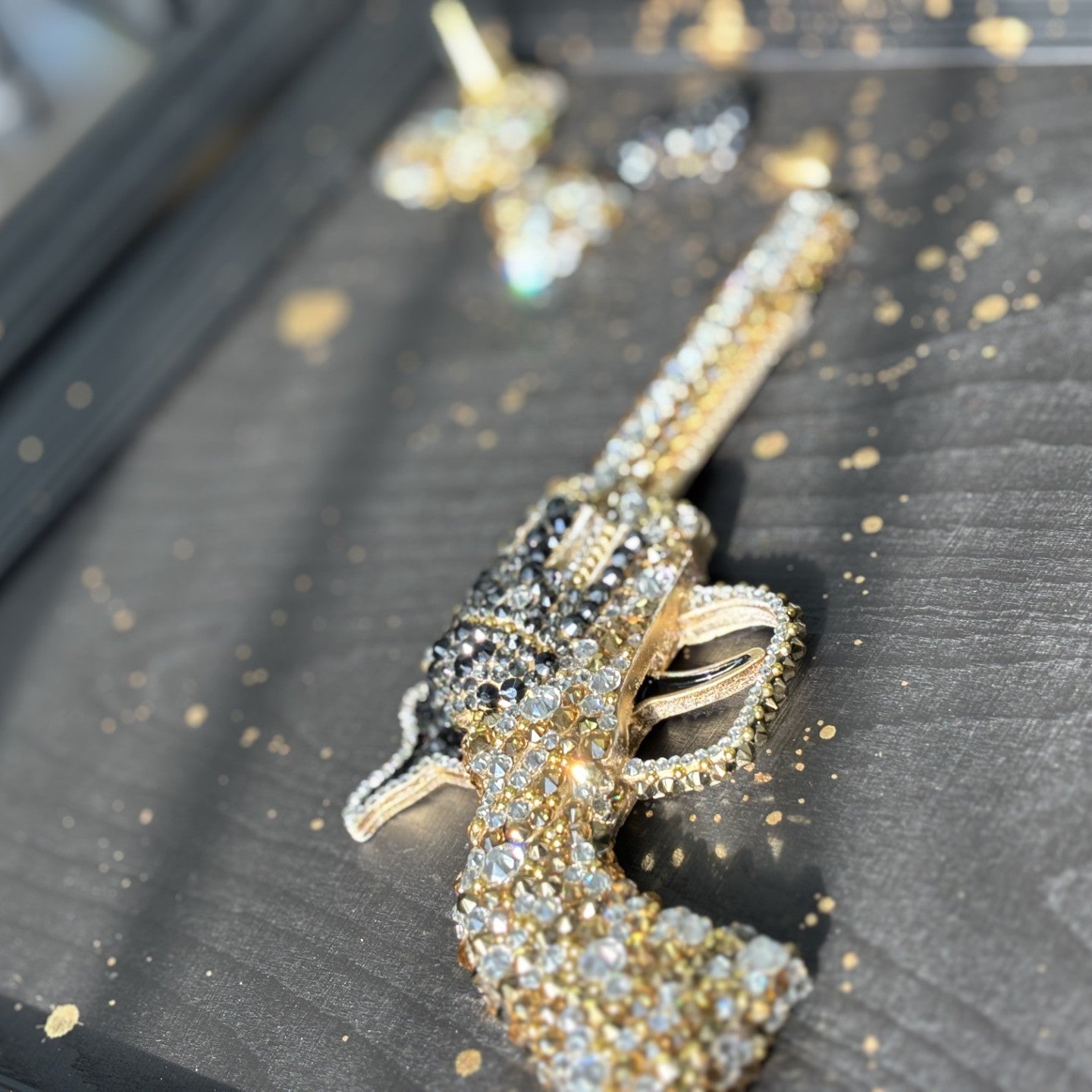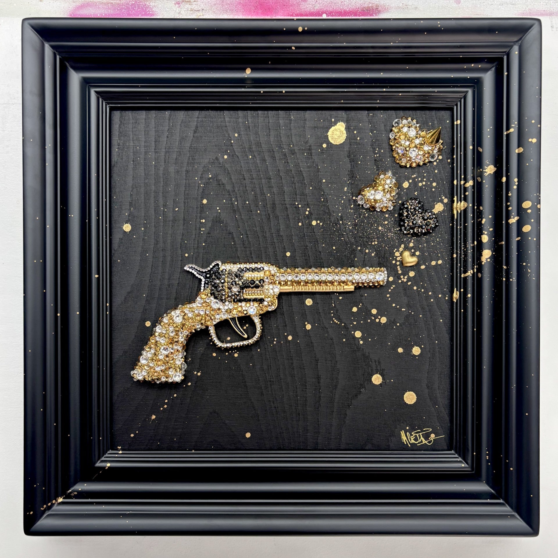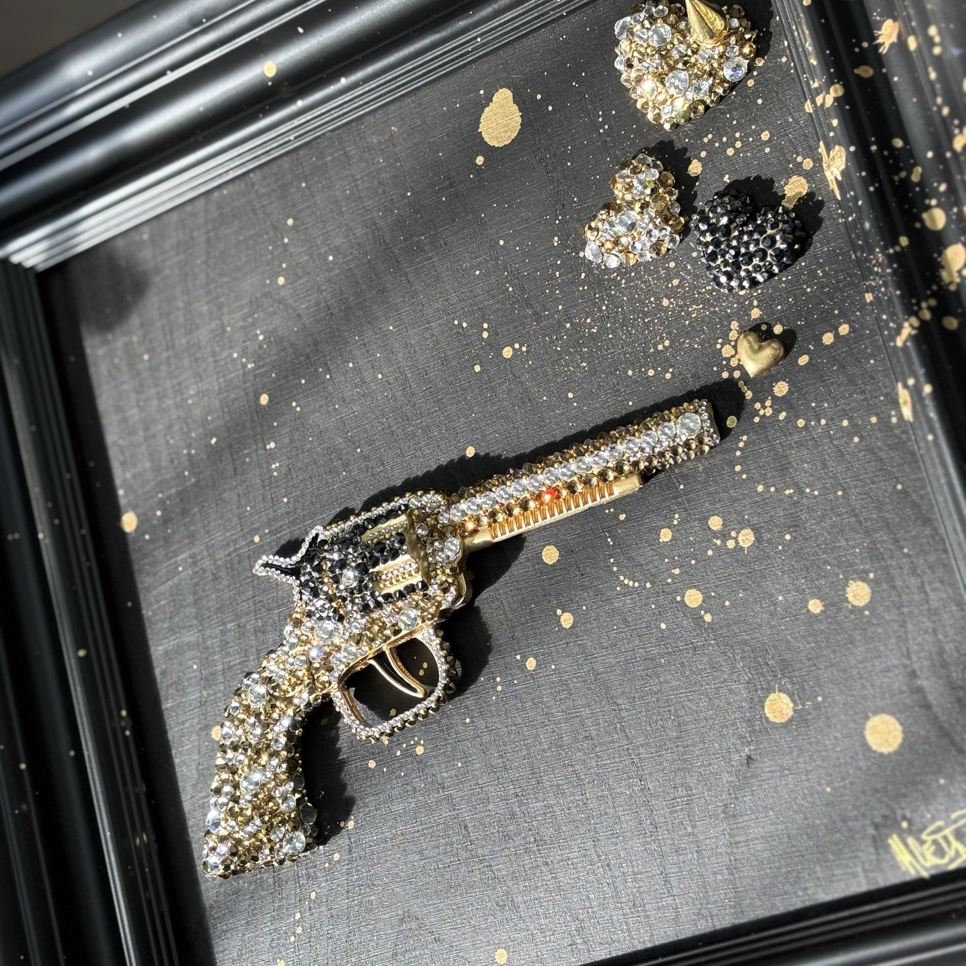 Make a bold statement with Bulletproof Love, a one-off piece from the exclusive Heartbreaker Collection. This striking artwork features hand-crafted gun and heart details, fully embellished with high-quality crystals that shimmer with every glance.
