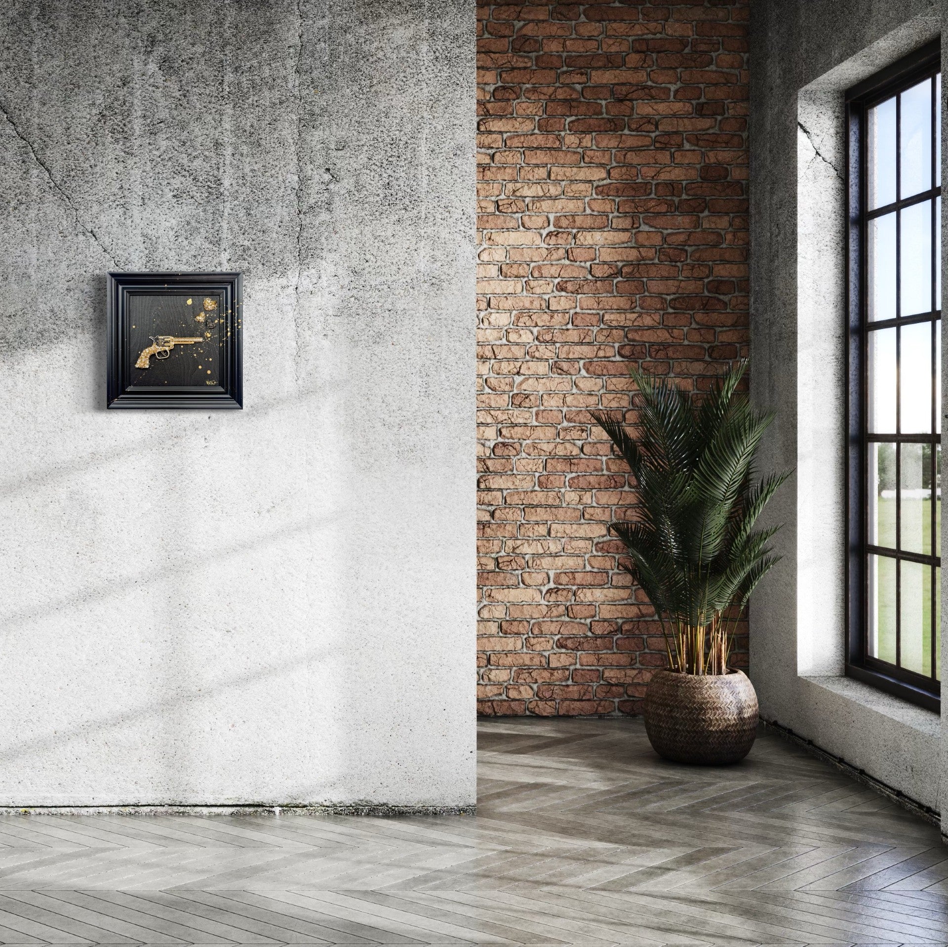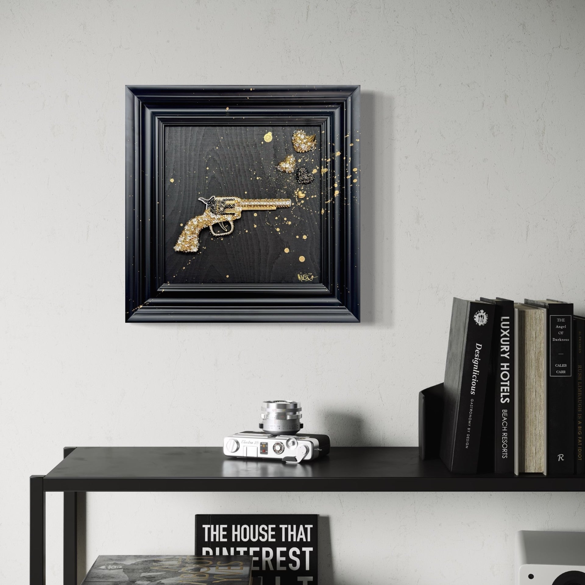 Set against a dramatic black and gold palette, the piece is framed in a bespoke, handmade black frame that adds depth, edge, and luxury.