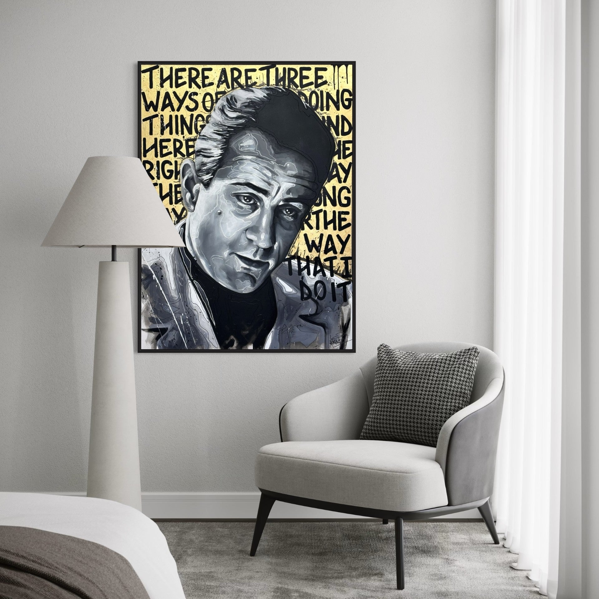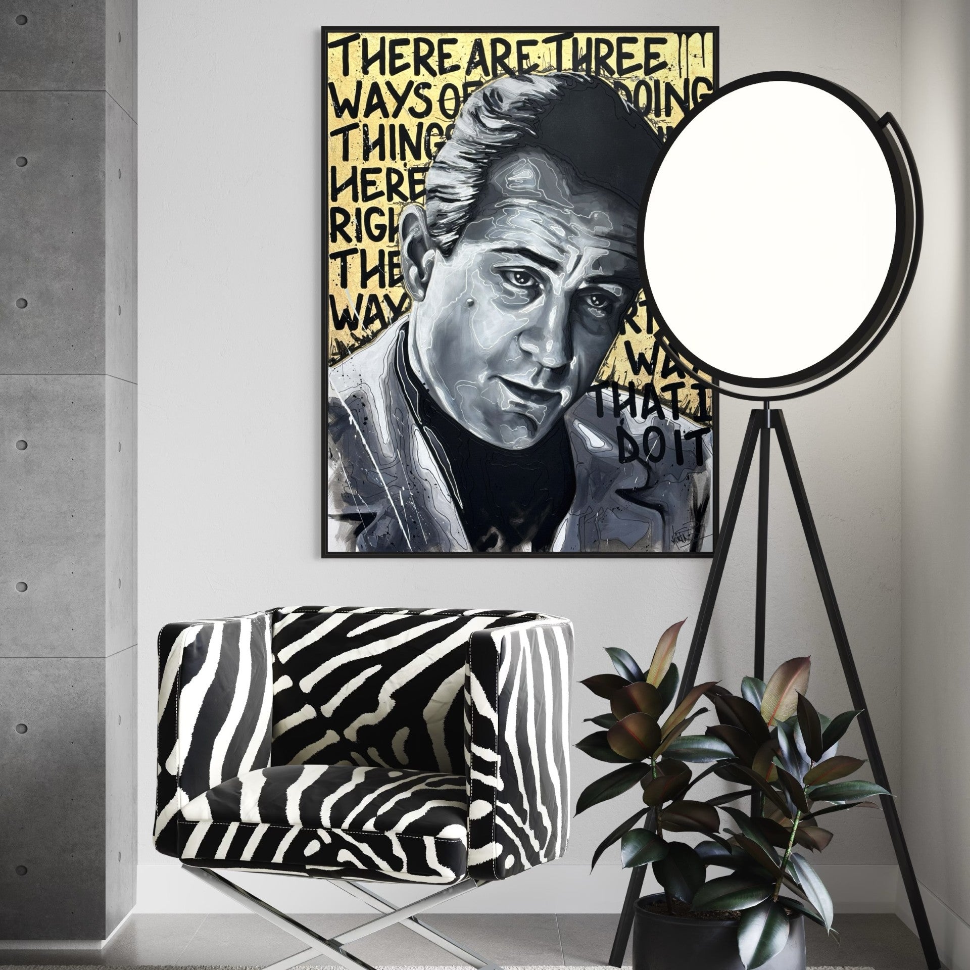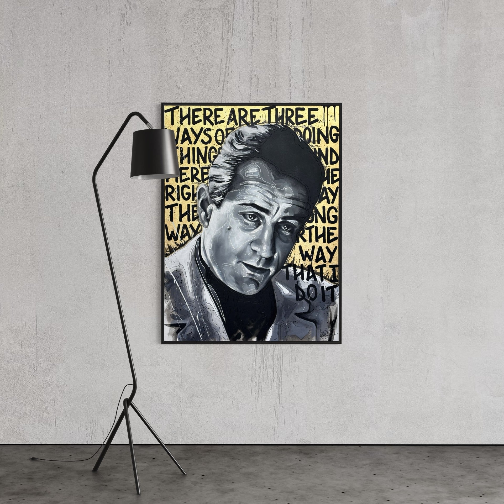 This acrylic painting on a 121cm x 91cm slim canvas is my take on the legendary Robert De Niro. I wanted to capture his unmistakable presence with bold brushstrokes and rich detail. The gold leaf adds a little extra drama and depth, making it a real statement piece for any DeNiro fan or art lover.